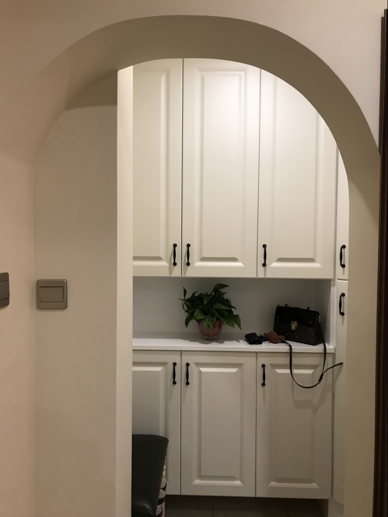 開門入戶,一扇圓弧形設計的玄關讓人瞬間有種偷窺的沖動。因為業主楊姐與設計師劉麗娟同為女性,在鞋子收納上有著強烈的共鳴。設計師為解決楊姐家中鞋子的收納,經過多次協商取得同意后,利用樓梯的安全通道,往外擴充4㎡左右,入戶鞋柜的增加既滿足了業主楊姐儲藏需求也保證了樓梯安全通道的正常使用。