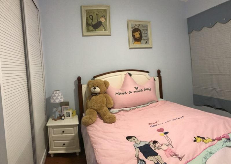 楊姐的女兒喜歡玩滑板,性格比較男孩子。在墻面顏色選擇上,設計師楊麗娟選用了男女生都能接受的淡淡藍灰色,配上白色百葉衣柜,瞬間清爽。