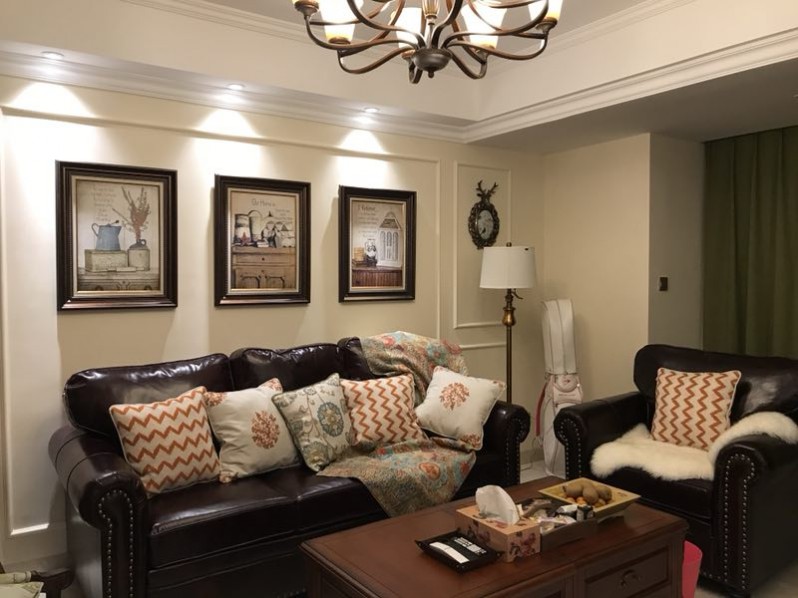 業主楊姐是第一次裝修,自己也不知道喜歡什么裝修風格。設計師劉麗娟在與楊姐的溝通過程中,發現楊姐喜歡深色家具,同時考慮到她的年齡與活波開朗的性格,最終設計成小美風。客廳處皮質的沙發配上花飾棉麻布藝單人椅,沉穩中帶著隨性自然,在燈光的照射下,溫馨的客廳讓人一眼就被吸引。