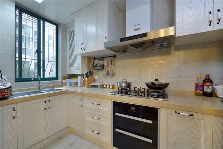 廚房墻壁上采用了白色的瓷磚,搭配上燃氣灶的背景墻,顏色的搭配看上去非常的簡潔,櫥柜呈L型擺放,將廚房的空間充分的利用起來,顯得非常的寬敞舒適,米黃色的櫥柜搭配上相近顏色的大理石臺面,顯得非常的精致漂亮。
