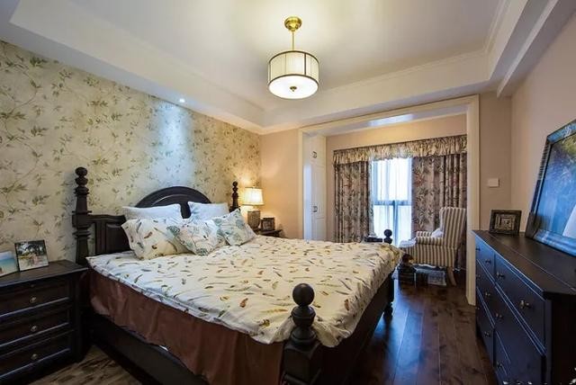 美式風格慣用成套的布藝軟裝來裝飾,例如碎花墻紙、窗簾、被單的碎花設計,帶有田園的清新淡雅感。