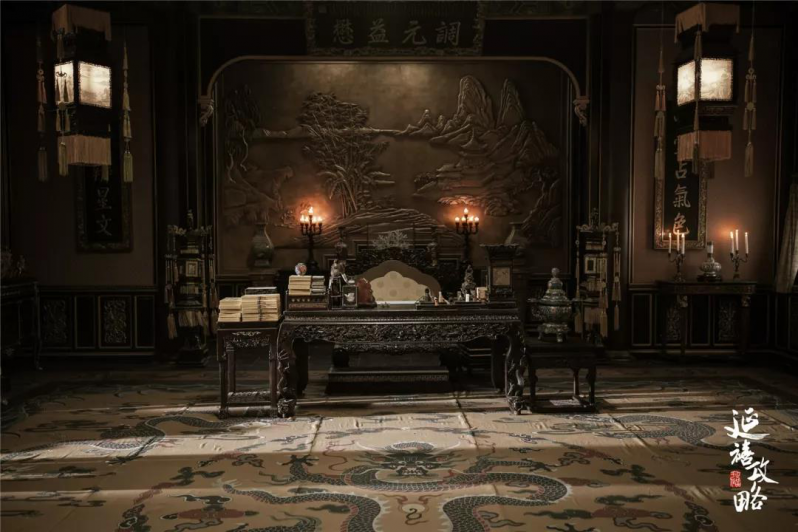 長(zhǎng)春宮使用大量紫檀木,鑲嵌白玉、墨玉、青玉點(diǎn)綴,酒紅色萬(wàn)字紋墻紙,明黃色幔帳、流蘇等將場(chǎng)景的大色調(diào)鎖定,以此突出富察皇后的高貴地位以及溫和善良的性格