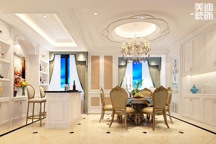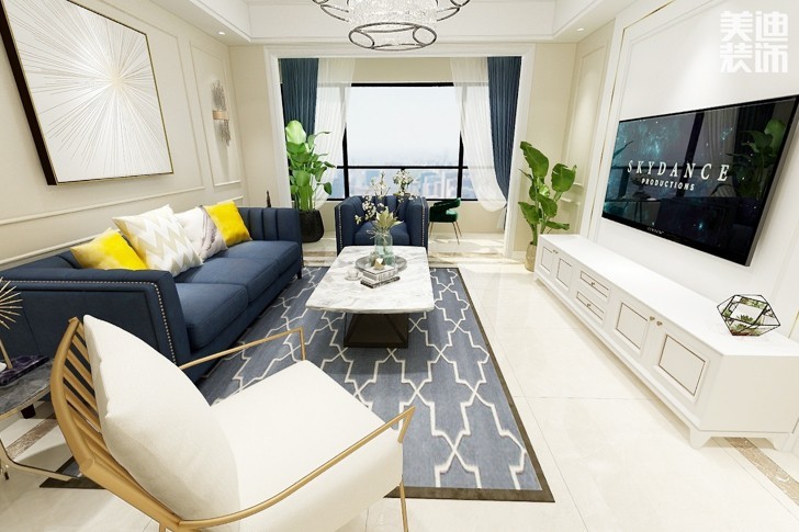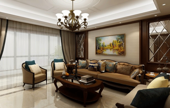 中心色為酒紅色、藍色和金色,沙發(fā)用酒紅色,地毯為暗土紅色,墻面用明亮的米色,局部點綴金色,如鍍金的壁燈,再加一些藍色作為輔助,即成華麗清新格調(diào)。