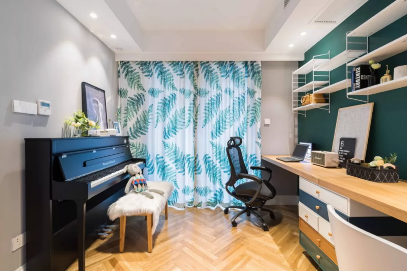 位于客廳沙發背后的書房空間,灰色和青色的墻面形成對比,把鋼琴和書桌區域給分開,墻面的置物架搭配雙人書桌的設計,滿足了書房的收納需求。