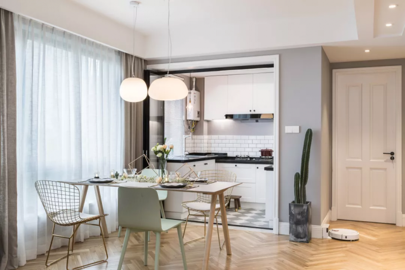 餐廳處把鐵藝餐椅、塑料餐椅和原木餐桌結合,搭配兩盞暖色的吊燈,餐廳給人一種精致優雅而又溫馨的感覺。