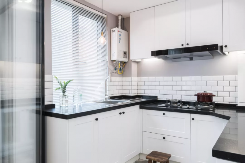 廚房內部是U字型的櫥柜布局,白色的柜體、黑色的臺面和小白磚、花磚、灰色墻漆的運用,讓廚房的層次分明,折疊門的使用也讓廚房平時更顯寬敞。