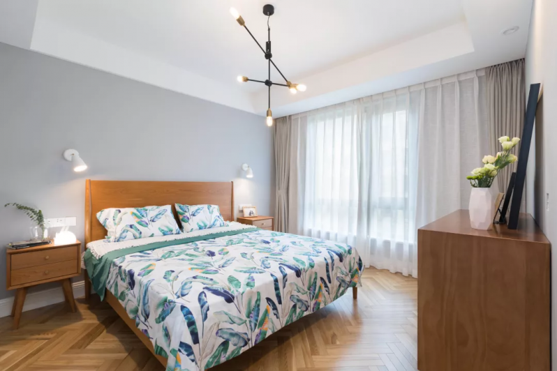 臥室內溫馨原木與清新被單的搭配相得益彰,一盞簡約吊燈,簡單明了的同時營造出自由舒暢的臥室氛圍。