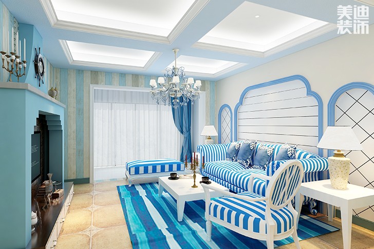 這款地中海風格臥室裝修在顏色上是不是就感覺特別的驚艷。藍色與綠色搭配既時尚又顯得非常的具有視覺上的沖擊力,地中海的裝飾也顯得非常的有個性,藍色與白色的背景墻又顯得非常的清新。