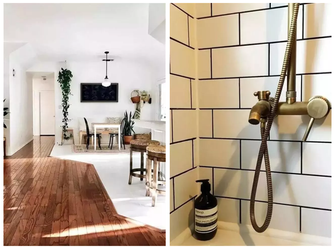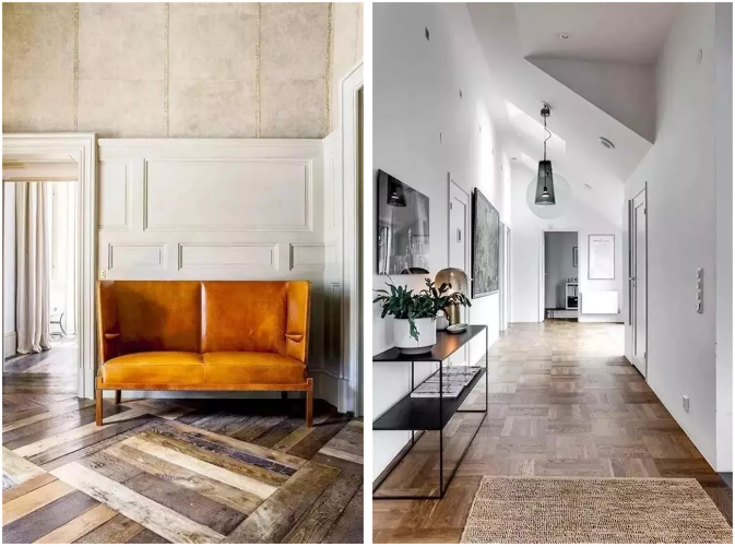 將各種不同規格、顏色的木地板拼接或者瓷磚與木地板混合拼接,這類拼接施工更復雜難度更高哦,但是藝術效果讓空間提升的格調不止一點點!