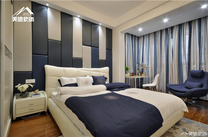 我們的主臥,整體色彩遵循“藍白”設計的感覺走。很喜歡設計師給我們設計床頭上的含義,拼色的床頭背景墻,凸顯出我們一家人的活潑。