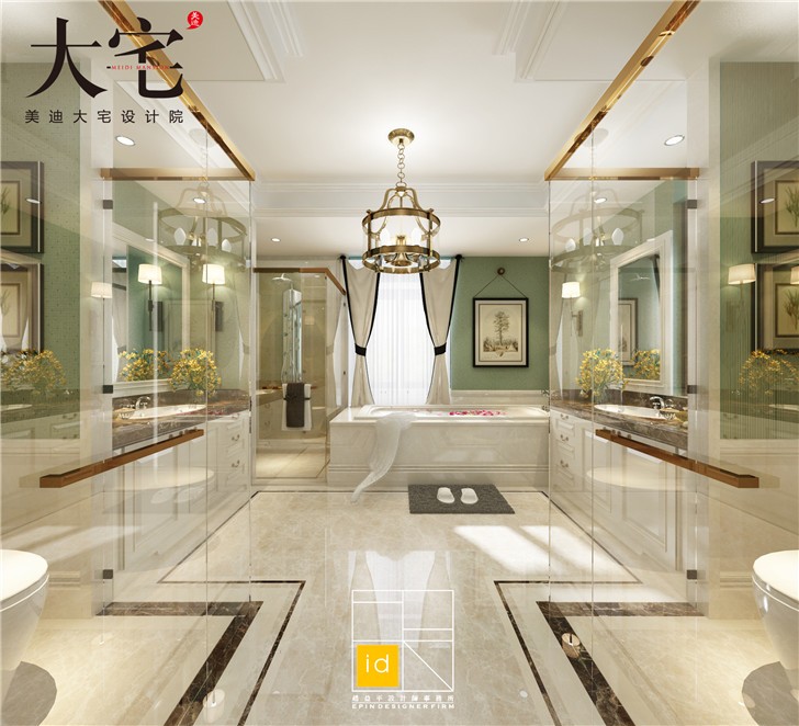 衛生間,簡歐式的洗手臺和衛浴柜提升了整體格調,充足的柜子保證了衛生間的收納需求。