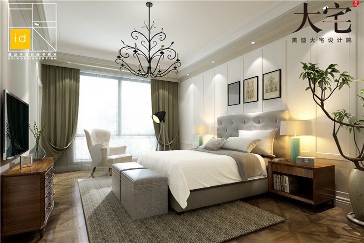 臥室設計在頂層,淺綠色的窗簾和白色的床上用品,凸顯主人高雅的品味。