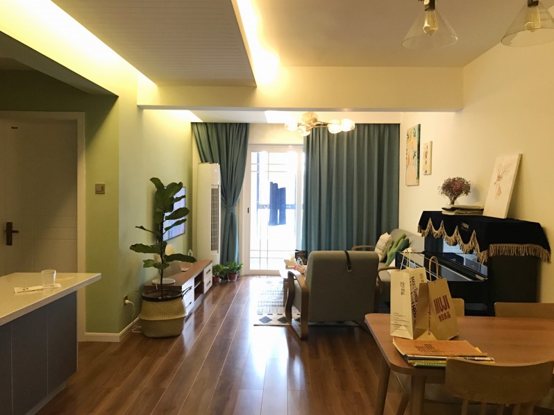 屋主是位有品位的鋼琴老師,陳姿設計師說屋主很喜歡綠色,又很符合樓盤的名字,所以整個空間以綠灰色為基調。在搭配上,淺色調的沙發、裝飾、吊燈等,再擺放上生機勃勃的綠植,看起來簡約大方,還有溫馨的感覺。軟裝都是屋主小姐姐精心挑選布置的,小編已經默默種了裝飾畫的草。