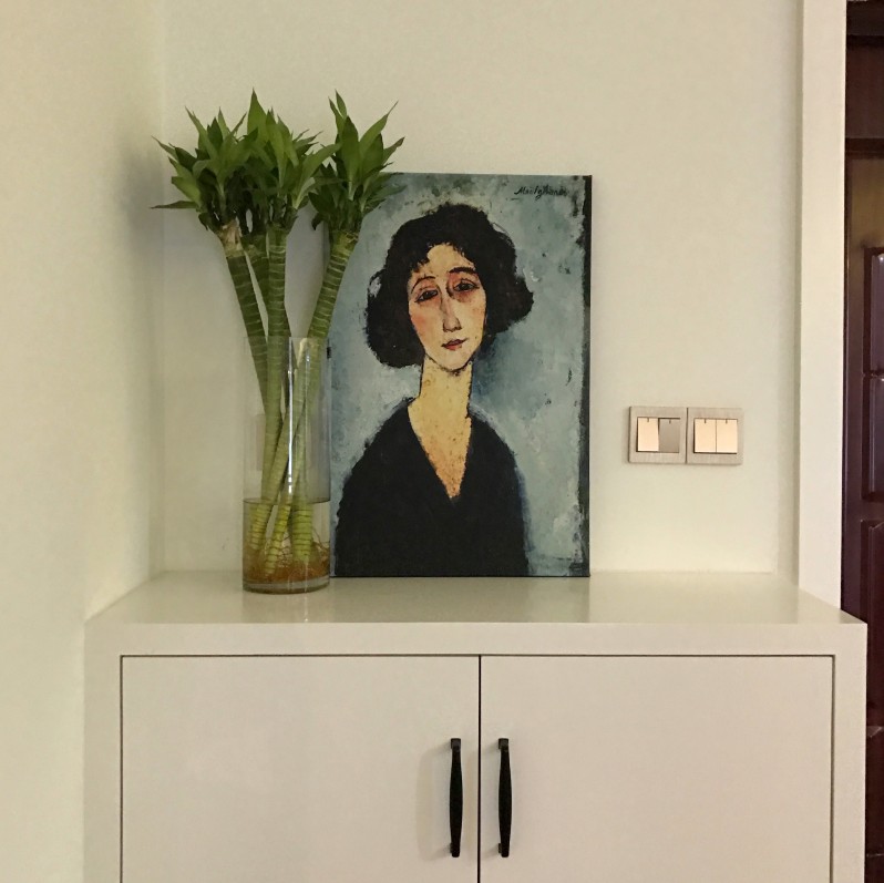 進門玄關設計很簡單,有一塊小走廊連接著廚房與客廳,走廊角落里擺放了一個儲物柜,可以放一些出門隨手物品。儲物柜上放置了一幅現代人物油畫和生機勃勃的綠植,搭配得剛剛好,一進門就擁有好心情。