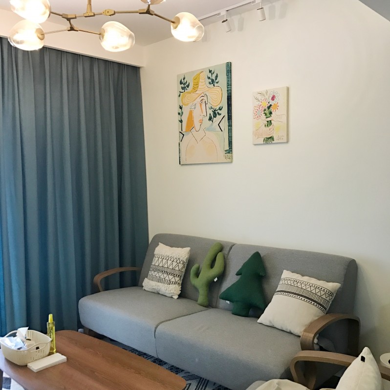 客廳墻面使用綠色+白色,視覺上比較舒服。為了讓顏色豐富一些,沙發上擺放了幾個顏色不同的靠枕。布藝沙發,慵懶舒適,讓人有種想躺上去的沖動,沙發背景墻用了兩幅畢加索抽象油畫做裝飾,抽象的線條、繽紛的色彩很有格調。