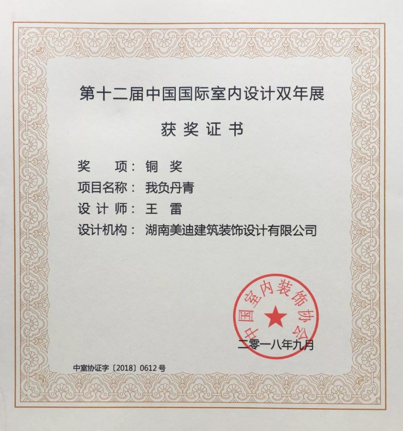 除美迪裝飾獲得“中國室內裝飾行業優秀企業”之外,美迪裝飾設計師趙益平(美迪大宅 設計院院長)、周港(總店 設計總監)榮獲“中國室內裝飾行業優秀設計師”稱號,設計師羅柯(總店 高級設計師)作品-《頌雅》、王雷(南店 主任設計師)作品-《我負丹青》獲得第十二屆中國國際室內設計雙年展-銅獎。