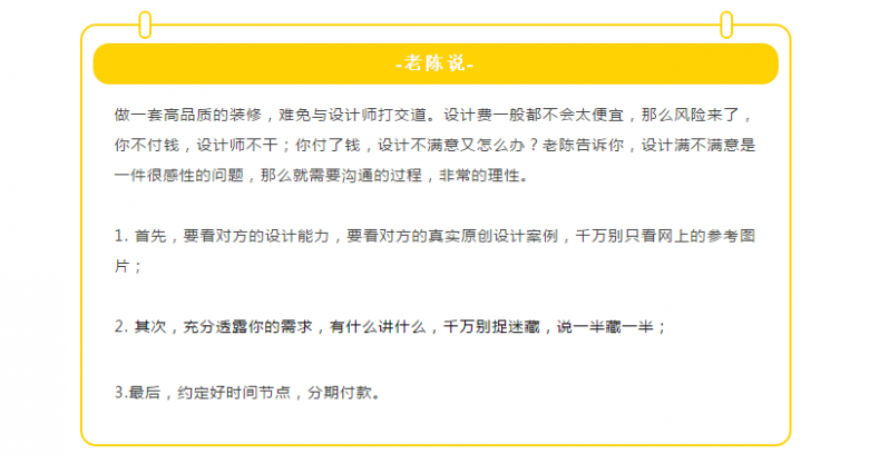 在裝修前,設計師與你的每一次溝通,都是為了能夠站在你的角度上去設計這個房子,在房子里烙上你的痕跡,也唯有這樣,才能打造出只屬于自己的家。如果你請了設計師,參考老陳的建議與設計師有效溝通。要是看完視頻還存在疑問,請你接著往下看!