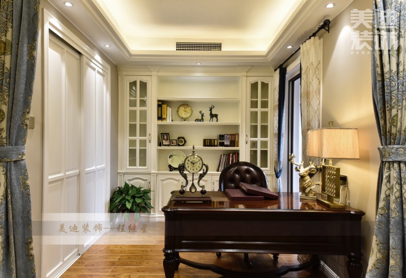 △質感厚實的書桌和美式座椅,深棕的色調看起來嚴肅且莊重,靜謐中散發出書卷香,書桌上復古擺鐘和裝飾品成為亮點。簡單的白色書柜,擺放了書籍和相片框,少了點華麗多了點輕松隨意。