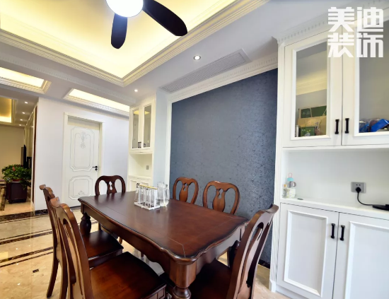 家居都選用深色實木,餐桌也不例外,為了不讓實木色和白色搭配太過單調,在兩側的收納柜中間,設計了跟客廳沙發墻一樣獨特的藍色背景墻。