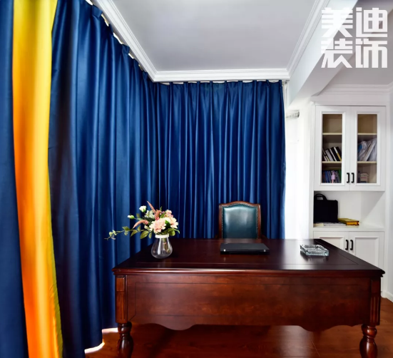 為滿足王先生的辦公需求,陳昌設計師將次臥的一部分和整個陽臺空間全部改成書房,深色的書桌和深綠色椅子,彰顯貴氣。