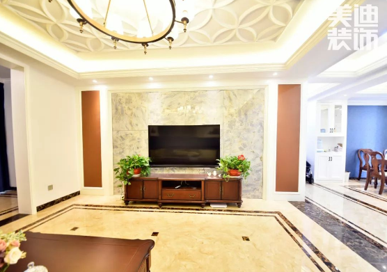 電視背景墻為避免瓷磚又太過單調,所以陳昌設計師從瓷磚的紋理上面入手,選擇有著大理石紋理的瓷磚,既容易清潔,又和地板紋理相同。