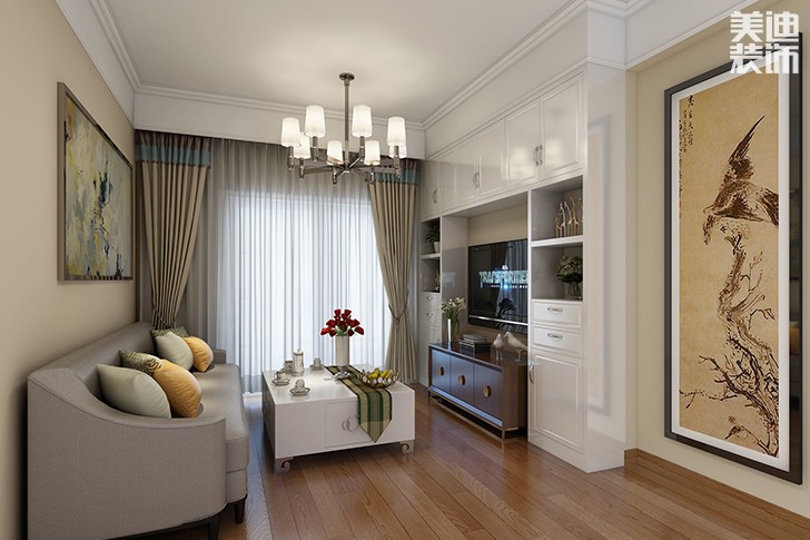 在格局的選取上決定利用客廳陽臺和餐廳區域這7平米的空間,陽臺作為主床區,利用榻榻米組合柜的形式充分利用空間,打造出一個1.5米的雙人床,和可以儲物的收納柜,原始餐區,打造了1.9米衣帽柜及工作臺,全部定制家具,合理利用了空間,沒有浪費,滿足了所有功能。