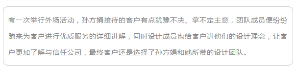 一根筷子容易折,一把筷子難折斷,團(tuán)隊(duì)亦是如此。不同于一般設(shè)計(jì)團(tuán)隊(duì)的帶領(lǐng)者,孫方娟看似溫潤而澤的性格背后,是在潛移默化之中將團(tuán)隊(duì)合作精神“融入”每一位設(shè)計(jì)成員的靈魂。打造一個有高度競爭力的團(tuán)隊(duì),對外客戶至上、對內(nèi)團(tuán)隊(duì)作戰(zhàn),共同成長,共同進(jìn)步。