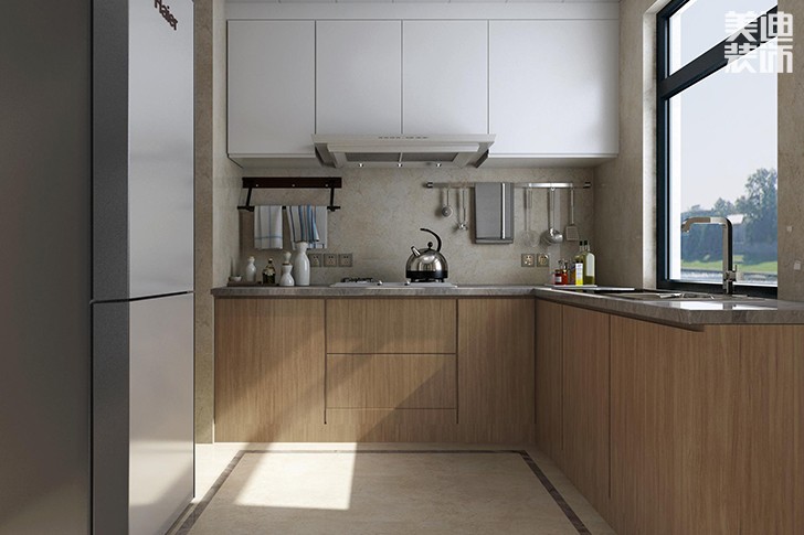 墻壁上采用了白色與藍色兩種顏色拼色的設計,另外在墻壁上打造了很多的隔板,精致的隔板使得墻壁看上去非常的有立體感,上面整齊的擺放了很多的東西,看上去錯落有致,另外靠墻也是做了一個大尺寸的柜子,將冰箱也是完美的鑲嵌在了里面。