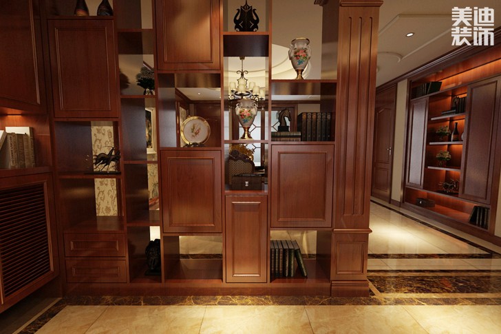 同樣以香檳色為主色調的餐廳,用深色的家具和彩色的裝飾瓷器點綴,加上彩色的植物,吃個飯都能覺得有活力。書房內的色調從頂部到地面,是白、灰、深木色的遞進,浮躁的心也得以慢慢沉淀,書桌正上方的吊燈是整個書房里最集中的大光源,更能讓人摒棄雜念,專心工作。