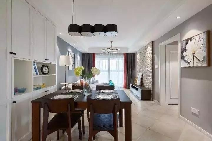 餐廳一邊背景墻用淺灰色乳膠漆裝飾,搭配素凈的花朵裝飾掛畫,自然干凈,看著非常舒服,餐桌選擇了深咖色,搭配同色系餐椅,顯得厚重而古樸,質(zhì)感而有力度,餐邊柜與玄關(guān)柜合并在一起,入頂式設(shè)計(jì),自然大方的白色,與深色互補(bǔ),不會讓人忽視其中一處。