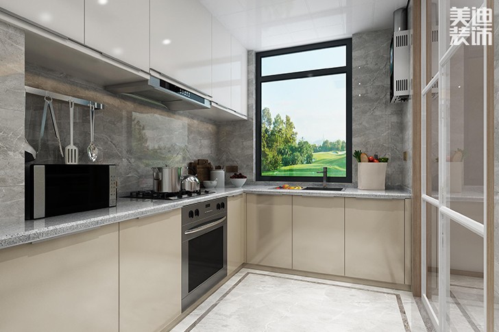 這款l型廚房裝修融入的歐式文化,櫥柜的設計融入了歐洲文明豐富的藝術底蘊和現代立異設計理念,使得人們得以在安靜幽雅中逐漸品味。