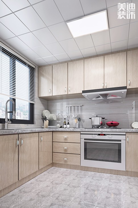 這款l型廚房裝修雖然簡約,但非常時尚,淺木色的櫥柜使得整個廚房充滿了青春氣息,櫥柜的布局設計非常適合大眾家庭,功能布局完全按照人體工學操作原理進行排列組合。