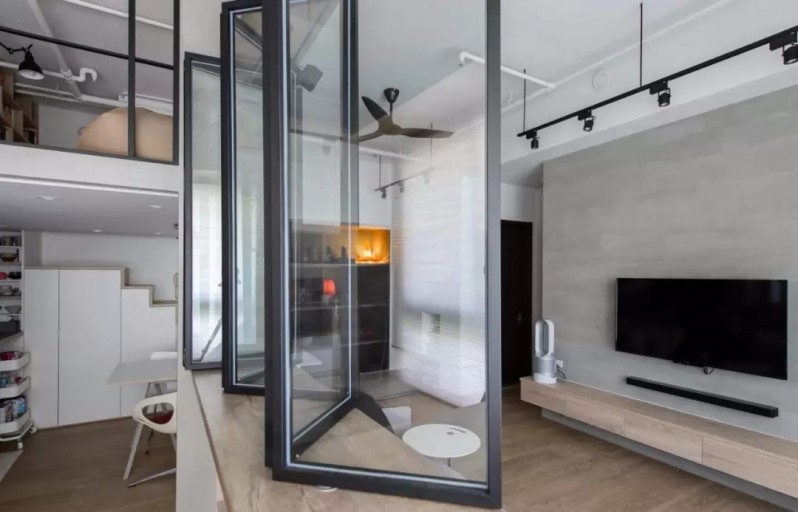 設計師讓餐廳、客廳、工作區以及二層的書房之間都采用玻璃門窗隔斷,以此來保證室內光線的充足,設計思路非常新穎,尤其是可折疊的窗戶,得到戶主家人們的一致稱贊。門口的鞋柜設計得也非常巧妙,節省了空間。