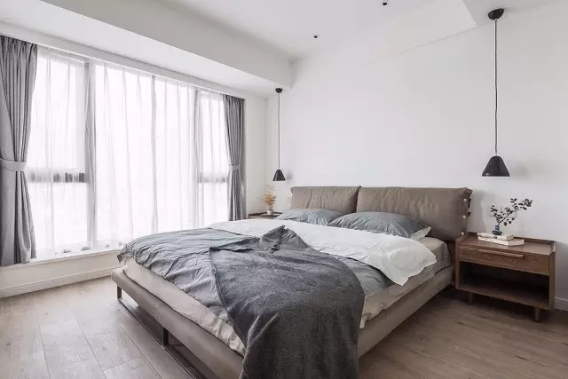 清新雅致的配色,讓人心曠神怡,簡單又妥帖,木質床邊柜與原木地板搭配,氣質一下就出來了!