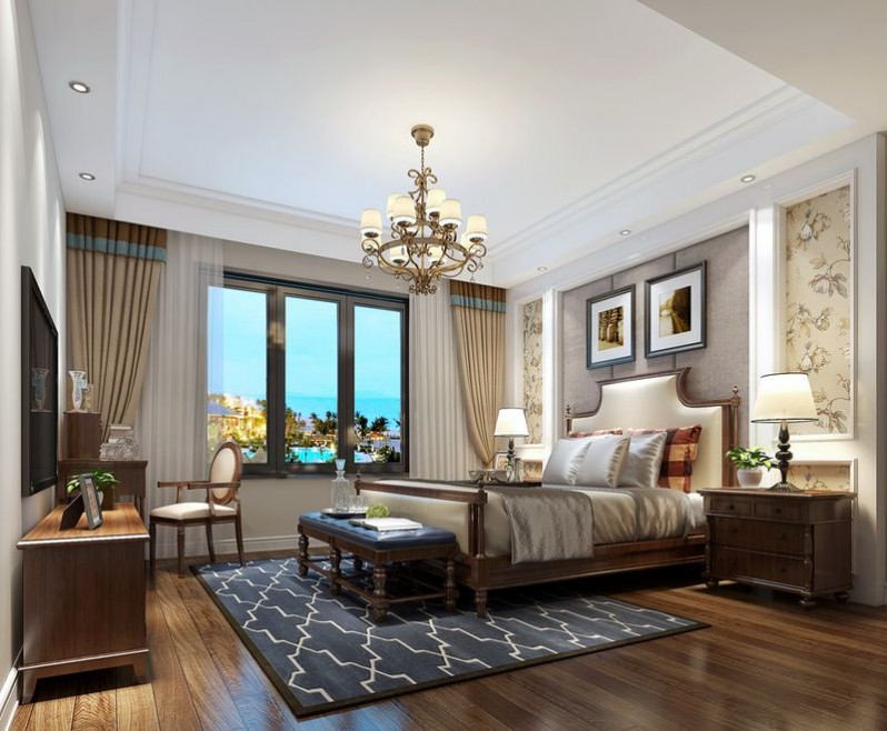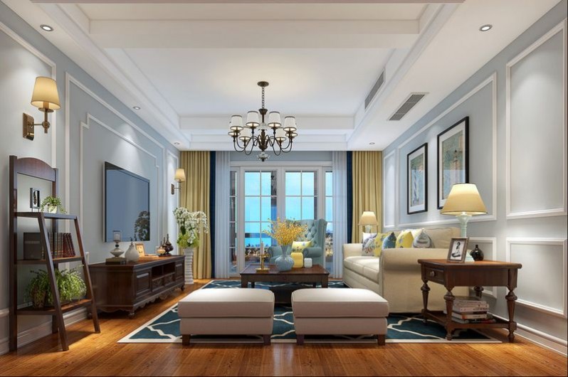 米色的布藝沙發(fā),金屬質(zhì)感的燈具,拼接的印花地毯,以及淡雅的花卉植物的搭配,跳出了傳統(tǒng)美式帶來的復雜感,給人一種個性而不失優(yōu)雅的感覺。
