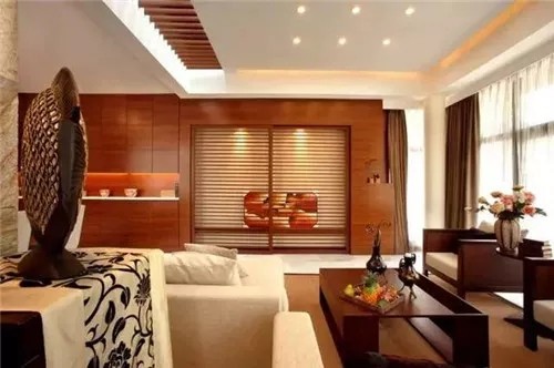 這款現代中式客廳裝修中,整體采用了簡單線條+棕色實木材質來裝飾,沒有采用過多的裝飾,只以光滑的平面為處理。在昏黃的燈光下,更有著暖意之中的寧靜感。