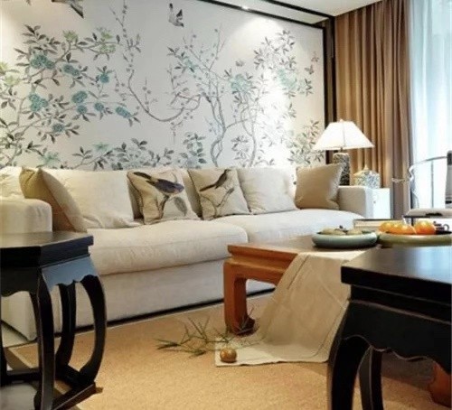 這款現代中式裝修中,壁紙雖有中國風情,但給人的感覺就是現代感很強。沙發并不是我們想象中的傳統樣式沙發,但舒適度很好,因為一般的年輕人都坐不慣那種硬木頭的沙發。