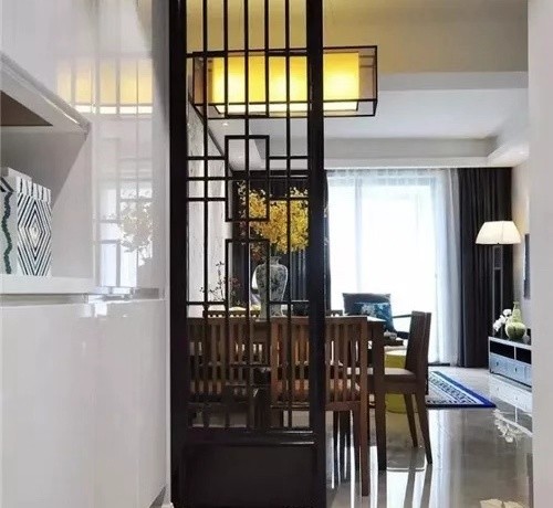 玄關采用了中式鏤空隔斷來打造,以免影響了風水。體現清晰的中式立意,表達美學中影影綽綽的意境。底部全木板的設計,可加固花格的強度,防小孩踢,防玩具車撞擊,也擋住冬天里穿堂的腳底涼風。