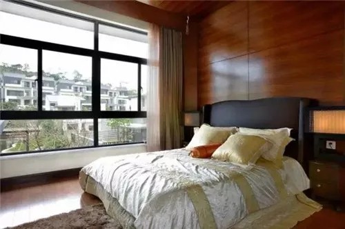 臥室墻面以窗而設,達到了很好的視覺效果。墻上以黑白黃+豎條狀的壁紙來裝飾,帶來了簡潔硬朗的質感。家居以深棕色的實木材質來裝飾,整面墻以櫥柜的設計,很好的展現了設計感與實用性并存的局面。床上絲綢質的床品,與整體簡潔中又展現了大氣。