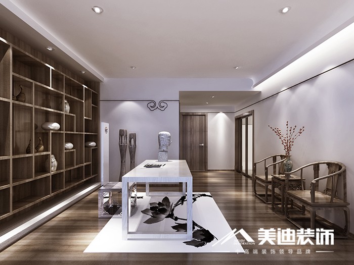 在空間基色上盡量選擇淡色,給相對偏深偏暗的中式家具和飾品一個色彩的視覺緩沖。也可適當的使用濃烈的色彩產生強烈的視覺對比。