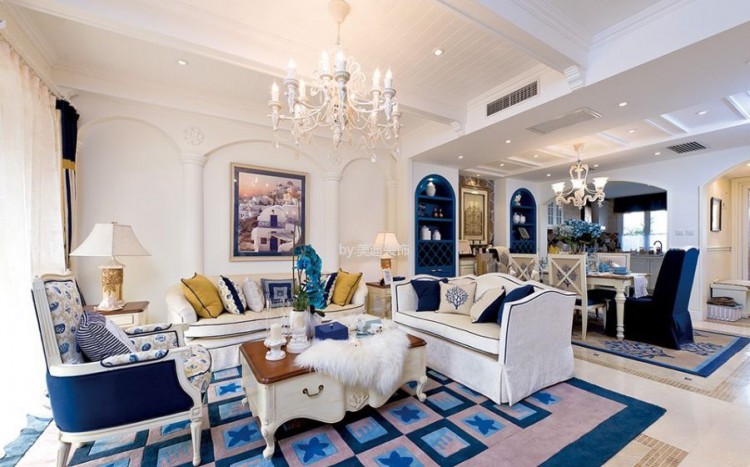 地中海風格在顏色的采用上,比較百變,以藍白相間海軍魂為主色調,配以沙灘的顏色,讓人仿佛置身于大海。