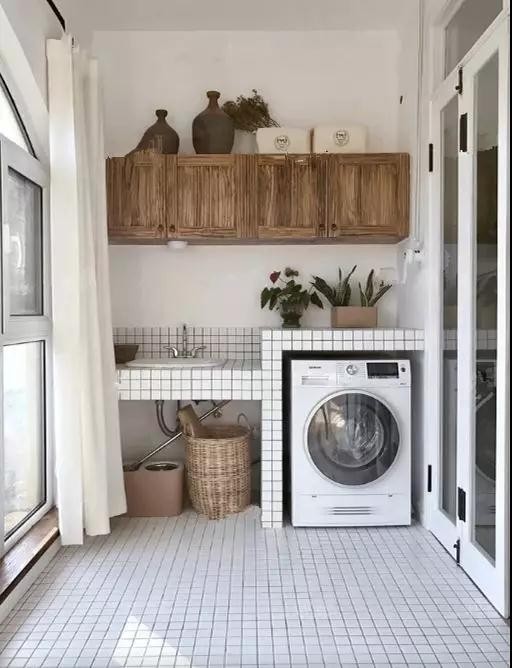 衛生間絕對是放洗衣機的絕佳場所,一般衛生間都會預留出一個屬于洗衣機的進水口和出水口,所以相對來說上下水也很方便。