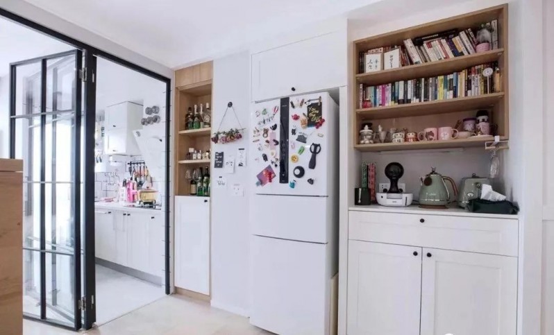 木作系統柜,內嵌冰箱,兩側規劃多層置物擱板,無論是書籍、擺設瓶罐,都有地方放了。