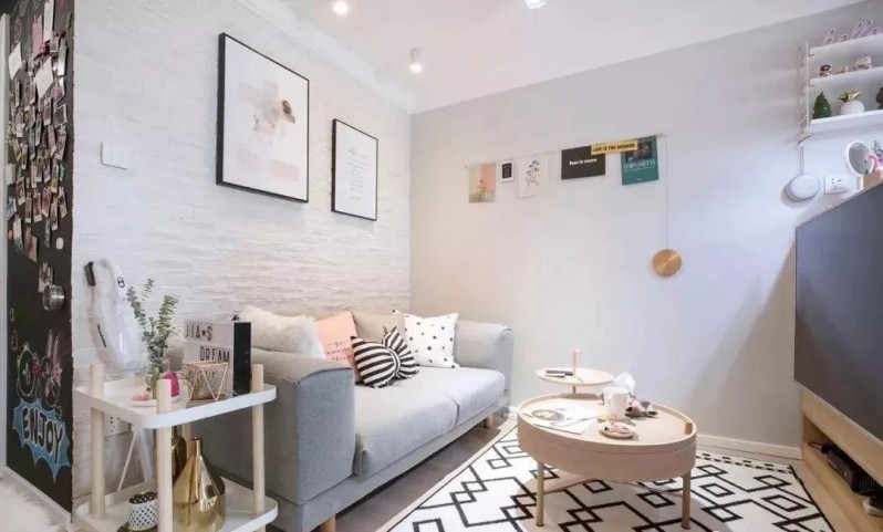 沙發背景墻用白色文化磚做點綴,雖然同是白色,卻比只刷白漆的墻面多了幾分線條感。灰色沙發搭配原木色家具,穿插一抹粉色調,俏皮清新。