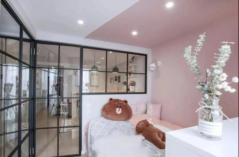 臥室部分墻面涂刷粉色乳膠漆,少女心爆棚,搭配黑色鐵件隔斷與門片,高級感十足。