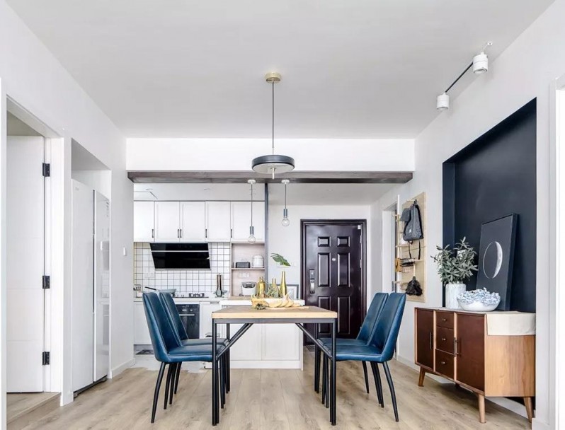 整個(gè)戶型可謂是處處做劃分,但是卻不做隔斷,既能獨(dú)立,又不完全失去交流溝通的功能,入戶玄關(guān)就能看到餐廳,一張淺木色餐桌擺放在過(guò)道正中間,簡(jiǎn)單而溫暖,而海藍(lán)色餐椅則是極為精致典雅的,讓餐廳冷暖深淺色調(diào)互補(bǔ)的同時(shí),還更加端莊沉穩(wěn),餐邊柜選擇了深咖色,讓人不會(huì)因?yàn)椴鸵味鲆曀钆浜谏尘皦Γ瑫r(shí)尚大氣精練。