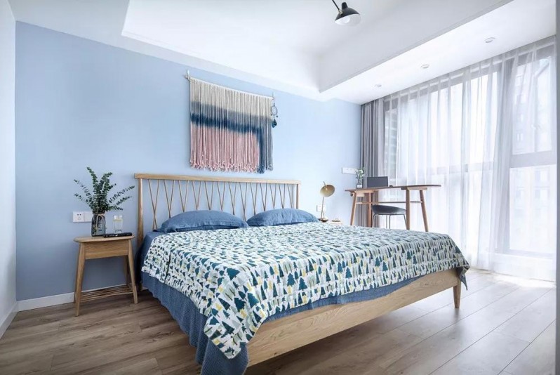 床頭天空藍(lán)背景墻優(yōu)雅寧?kù)o,與深藍(lán)色床品相呼應(yīng),原木臥床軟靠的設(shè)計(jì)仿照藤編的樣式,非常的輕盈休閑,兩邊的床頭柜和地板都是原木材質(zhì),營(yíng)造溫暖舒朗清新的睡眠空間。