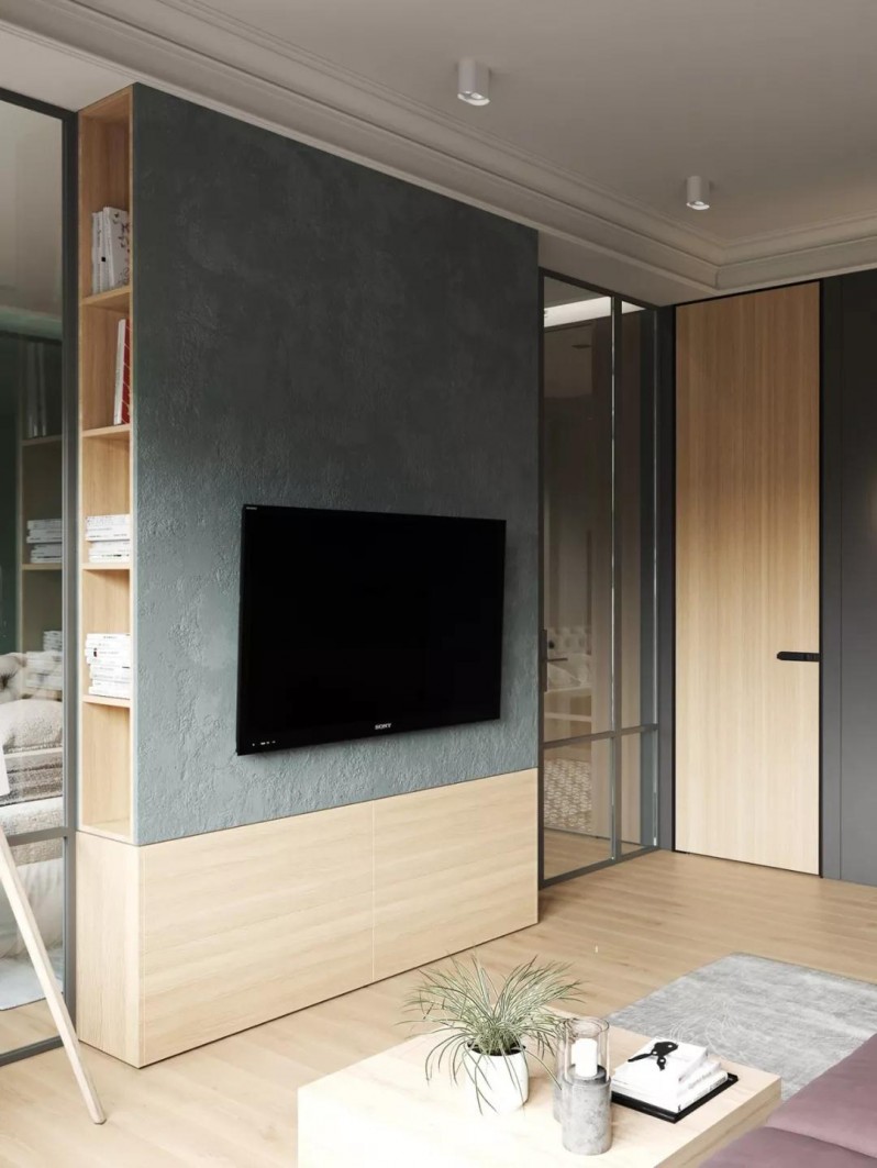 客廳和臥室之間,用電視墻隔開,電視墻側面做了收納格子,正面則是平整簡潔的墻壁,視覺上更單純。
