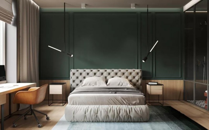 客廳的家具和墻面選擇了比較暗沉的色調,但由于地面是淺色的地板,部分墻面也用了護墻板,所以整個空間并沒有顯得壓抑。