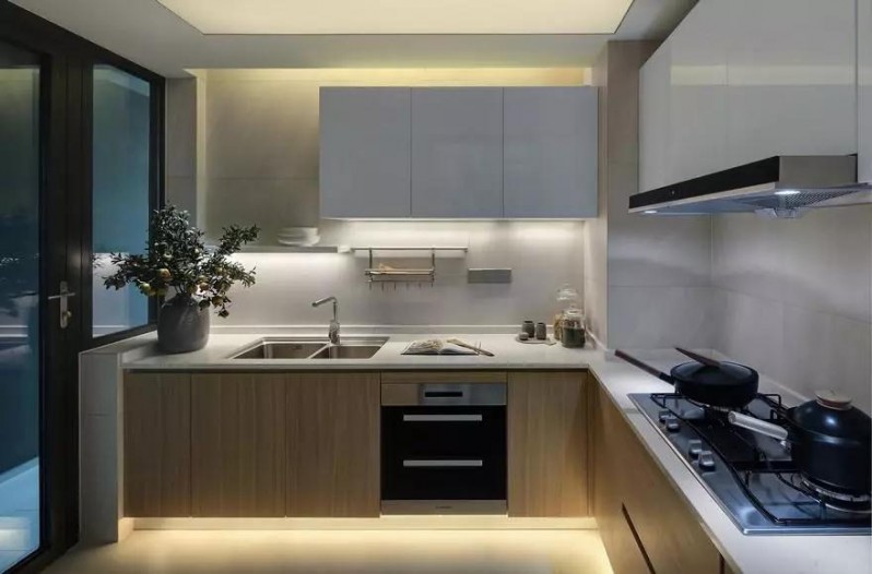 廚房是相對獨立的L型空間,使用了亮光白和淡木紋面板,這種相對簡約的色調(diào),會讓進行烹飪工作的人心情更加輕松自如。